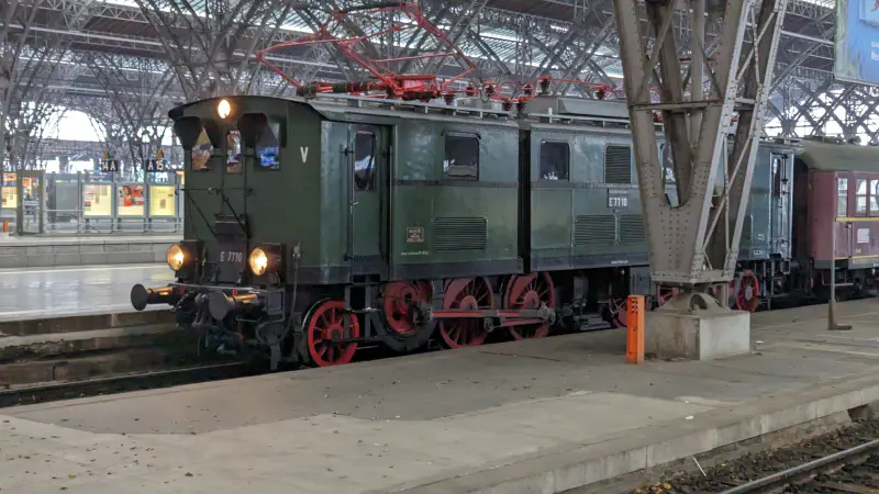 Doch meine Zeitreise endete nicht bei den majestätischen Dampfloks. Eine historische E-Lok komplettierte mein Erlebnis am Leipziger Hauptbahnhof. Die E-Lok repräsentiert die Moderne, in der elektrische Energie die Schienen erobert hat, und zeugt von der anhaltenden Innovationskraft in der Welt der Eisenbahn.