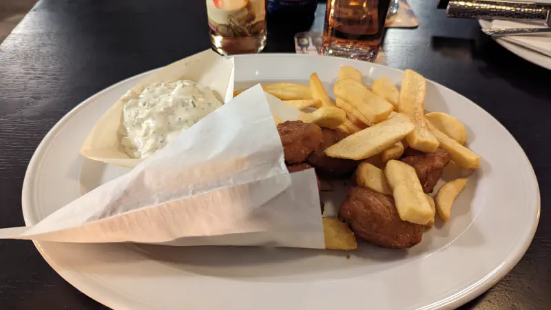 Nachdem ich die Brücke besichtigt hatte, ging ich in die Innenstadt von Rendsburg. Dort gibt es viele schöne Geschäfte und Restaurants. Ich habe mir ein leckeres Abendessen in einem kleinen Restaurant gegönnt.